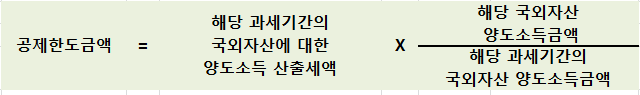 ① 외국납부세액의 세액공제방법 : 해당 과세기간의 양도소득 산출세액에서 국외자산 양도소득금액이 그 과세기간의 양도소득금액에서 차지하는  비율을 곱하여 산출한 금액을 한도로 국외자산 양도소득금액해당 과세기간의 양도소득 산출세액에서 공제하는 방법이다