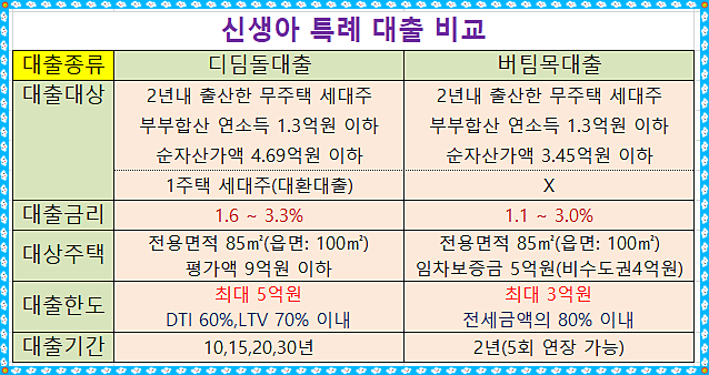 정부에서 우리나라의 저출산 문제를 극복하기 위한 주거지원책으로 2024.1.29.일자로 신생아 특례대출 제도를 발표하였는데, 2023.1.1.일 이후 출생한 신생아가 있는 가구 또는 임신중인 가정이라면 크게 도움 될 만한 획기적인 정책입니다. 물론 이것으로 인하여 젊은이들이 아이를 더 많이 출산할까 의문이지만 아이를 가진 가정의 안정된 주거를 응원합니다. 신생아 특례 대출에는 신생아 출산 가구의 주거안정을 위하여 특례로 주택구입자금을 대출해주는 신생아 특례 디딤돌대출과 전세자금을 대출해주는 신생아 특례 버팀목대출이 있습니다. 신생아특례 디딤돌대출에 대하여는 앞서 포스팅을 했기에 금회에는 저렴한 이율로 신생아특례 전세자금 대출받아서 전세로 거주하게 되는 신생아 특례 버팀목대출에 대하여 총정리를 해 보고자 합니다. 먼저 아래 표로 신생아특례 디딤돌대출과 버팀목대출을 비교하였으니 참조하시기 바랍니다.