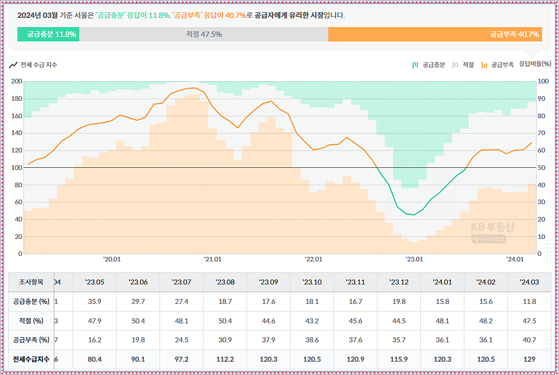 2024년 3월 현재 서울의 매수우위지수는 29.7로 낮으나 전세수급지수는 129로 상승하고 있습니다. 이는 서울의 전세 공급이 부족하여 향후 전세가 매수를 자극하여 아파트 가격을 상승으로 이끌 수도 있음을 보여주고 있습니다. 따라서 서울의 내집마련을 원하는 분은 신생아 특례 및 신혼부부 특례를 이용하여 기존 주택을 매수하거나 특별공급으로 주택청약하여 내집마련도 검토해 보는 것도 괜찮을 듯 합니다.