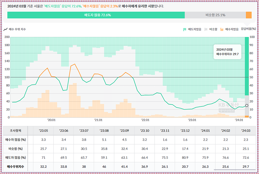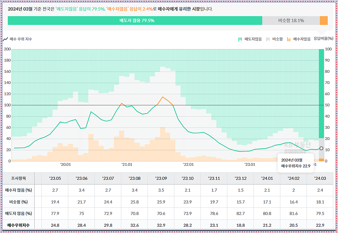 2024년 3월 현재 전국적인 아파트 매매시장은 매도자가 79.5%로 많은 매수자우위시장으로 매수우위지수는 100보다 적은 22.9에 불과합니다. 그리고 최근 아파트가격 하락이 멈추었다는 서울의 매수우위지수는 29.7로 미세하게 상승 중입니다.