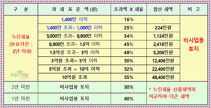 2년 이상 보유한 토지, 건물, 부동산에 관한 권리 및 기타자산에 대한 초과누진세율로 위의 2024년 양도소득세율표에서 "기본누진세율" 참조하시면 됩니다.